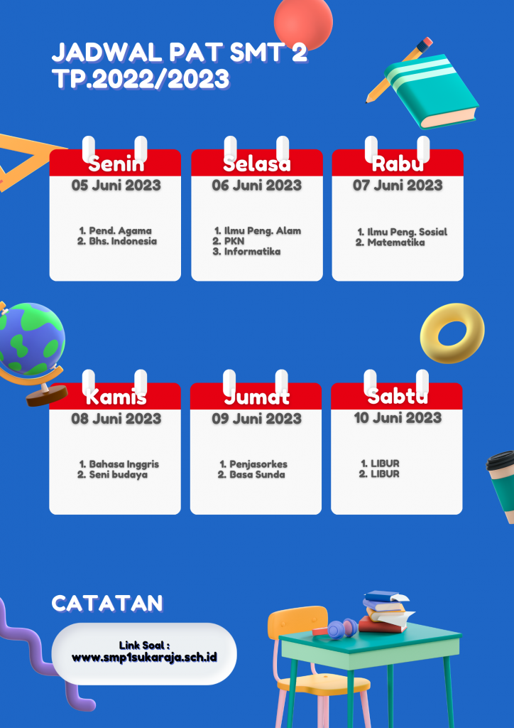 Pelaksanaan Penilaian AKhir Tahun dilaksanakan secara Daring pada tanggal 05 s/d 09 Juni 2023. Sesuai Jadwal yang sudah ditentukan Untuk Link soal, silahkan klik tanda panah pada Tab PAT lalu pilih Mata Pelajaran nya.