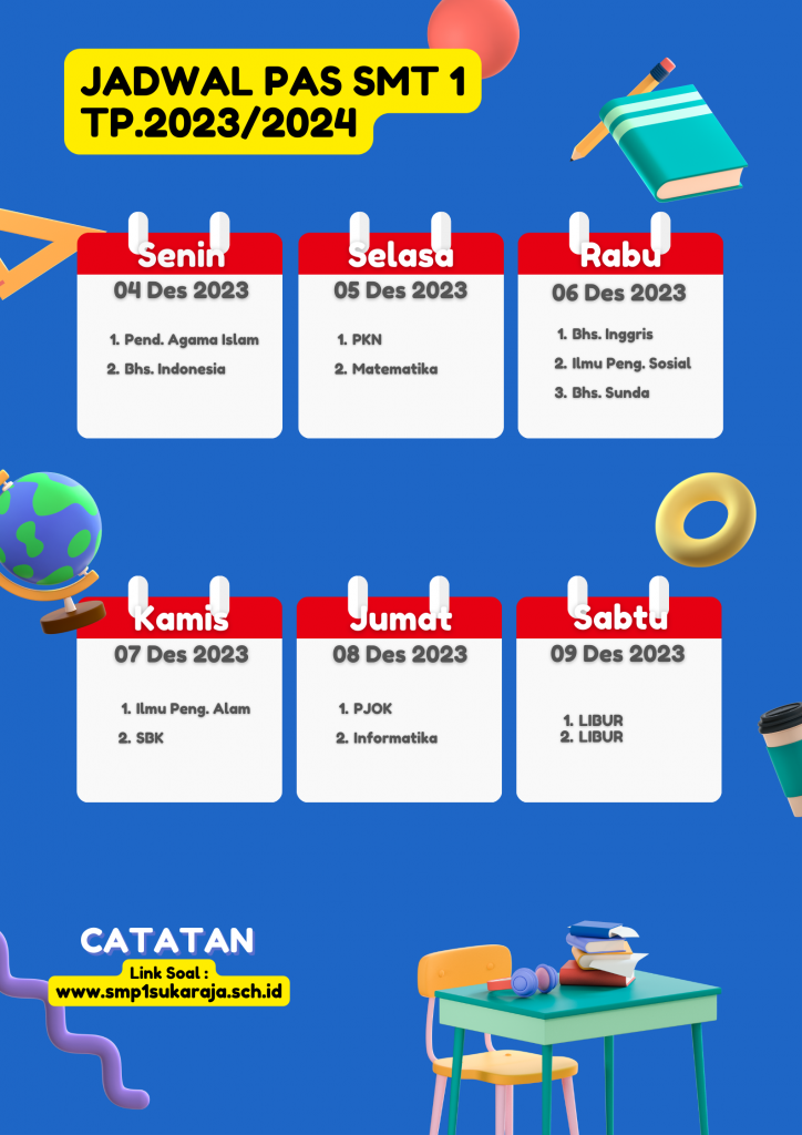 Pelaksanaan Penilaian Akhir Semester 1 dilaksanakan secara Daring pada tanggal 04 s/d 08 Nopember 2023. Sesuai Jadwal yang sudah ditentukan Untuk Link soal, silahkan klik tanda panah pada Tab PAS lalu pilih Mata Pelajaran nya.