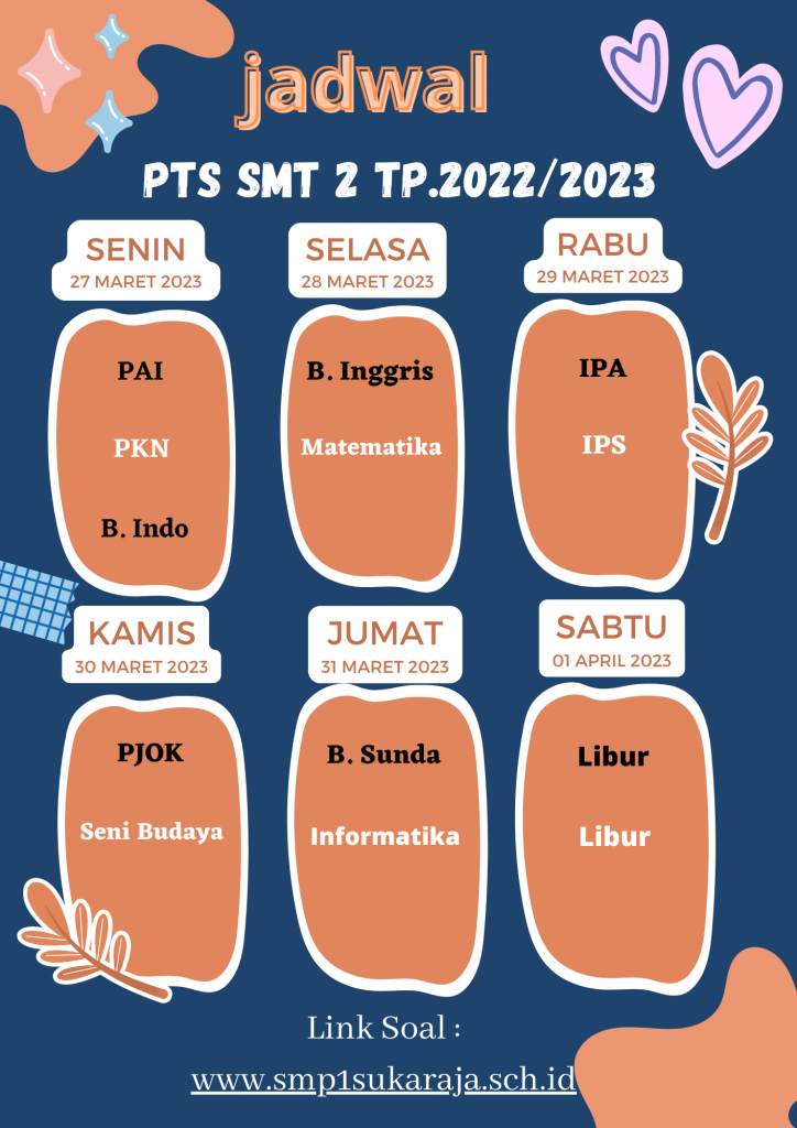 Pelaksanaan PTS dilaksanakan secara Daring pada tanggal 27 Maret 2023. Sesuai Jadwal yang sudah ditentukan Untuk Link soal, silahkan klik tanda panah pada Tab PTS lalu pilih Mata Pelajaran nya.